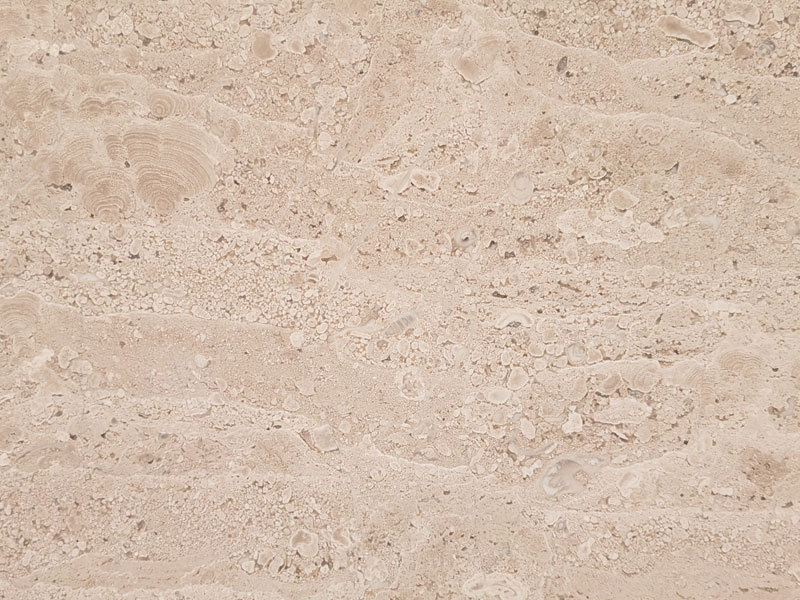 Die mineralische Zusammensetzung des Breccia Sarda ist vielfältig und basiert hauptsächlich auf Kalziumkarbonat. Er setzt sich aus Schichten von Kalkstein- und Dolomitmarmor zusammen und ist von feinen Adern aus Kalzit und Onyx durchzogen. Die in der Gesteinsmatrix eingebetteten Fossilien, Muscheln, Algen und Mineralien sind nicht nur Zeugen seiner geologischen Vergangenheit, sondern prägen auch maßgeblich sein einzigartiges Erscheinungsbild. Die Farbpalette des Breccia Sarda erstreckt sich von warmen Beige- und Cremetönen bis hin zu zarten Haselnussnuancen, wobei häufig braune Adern und dunklere Einsprenkelungen auftreten. Sein Muster wird oft als lebendig und natürlich beschrieben.