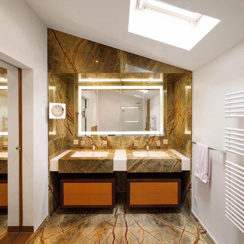• Geschäftsräume: In repräsentativen Geschäftsräumen setzen Natursteinplatten auf Maß oder Bookmatching-Wandverkleidungen eindrucksvolle Akzente.